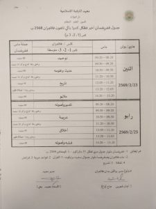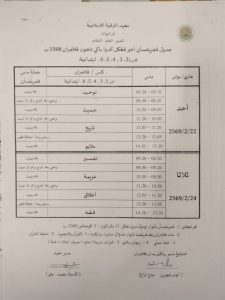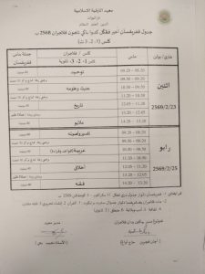 ตารางสอบปลายภาค ภาคเรียนที่ 2/2558 9 กุมภาพันธ์ 20269 กุมภาพันธ์ 2026ฝ่ายวิชาการข่าวประกาศ จำนวนผู้เข้าชม : 6 ตารางสอบชั้นอิสลามศึกษา ตารางสอบชั้นสามัญศึกษา